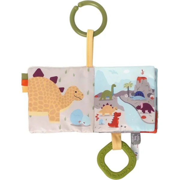 Le livre tissu bébé – Les Amis Dinos est un mini livre d’éveil idéal pour stimuler les sens de bébé en déplacement ou à la maison. Facile à saisir et à manipuler, il éveille les tout-petits grâce à son mélange de textures douces : cuir végan, tissu imprimé bruissant, éléments en peluche et détails brodés. Avec des activités ludiques comme un anneau de dentition, un pouet sonore et des rubans colorés à attraper, il encourage la découverte tout en favorisant le développement de la motricité fine et de la coordination œil-main. Ses illustrations colorées sur le thème des dinosaures captiveront bébé et le familiariseront avec les animaux. Grâce à sa boucle d’attache, ce livre tissus se fixe facilement à la poussette ou au cosy, pour l’accompagner partout, que ce soit lors de balades ou de moments de détente.