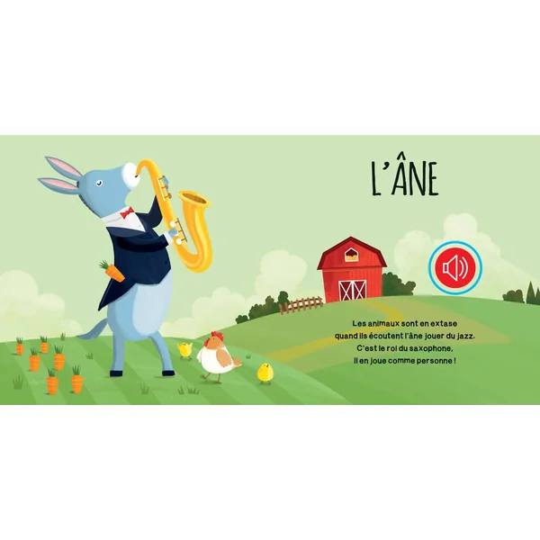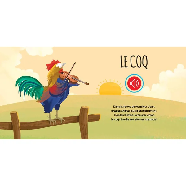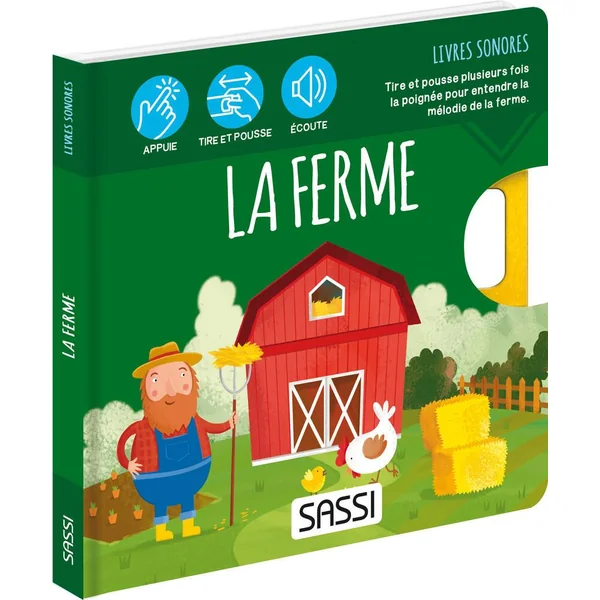 Voici les petits animaux de la ferme. lis leurs aventures, appuie sur les boutons et apprends à reconnaître leurs cris. Tire et pousse la poignée : une douce mélodie accompagnera ta lecture
