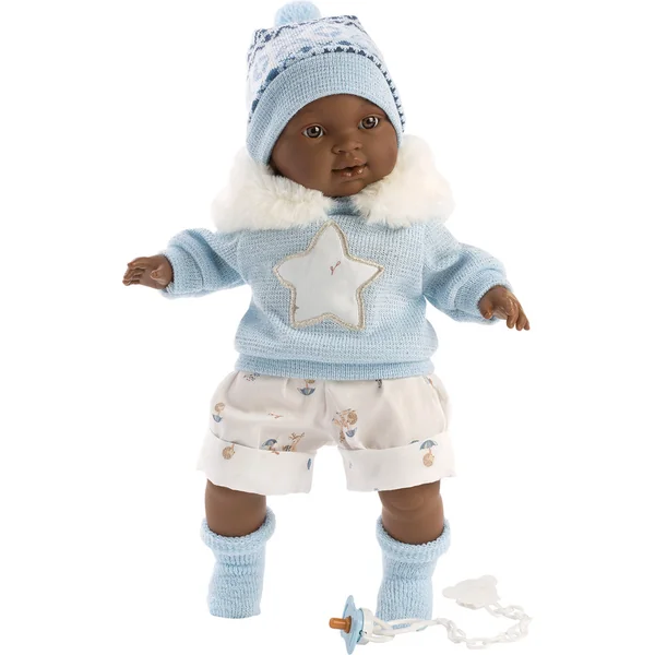 Poupée parlante avec un corps en tissu doux et des cheveux sur toute la tête. En retirant la tétine de sa bouche, la poupée commence à dire « maman », « papa » et émet un vrai son de bébé qui pleure. La poupée peut être apaisée avec la tétine. Taille 38 cm. L’emballage comprend 3 piles bouton LR44.