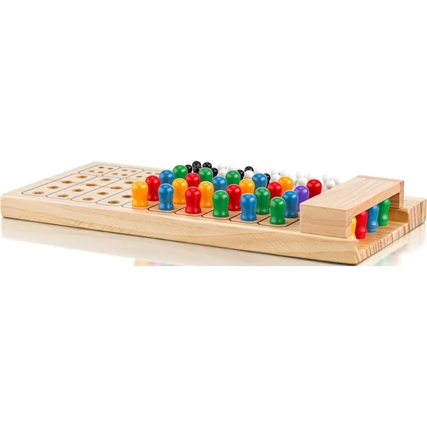- 1 joueur configure une combinaison de cinq piquets colorés sur le devant et l’autre joueur essaie de la deviner en dix tentatives.