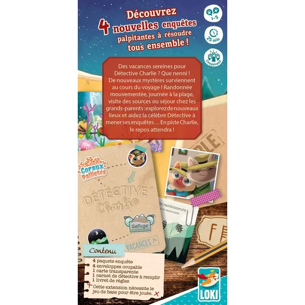 Cette boite est une extension du jeu Détective Charlie. Elle contient 4 nouvelles enquêtes à la difficulté progressive. Pour les résoudre, le jeu de base est nécessaire.