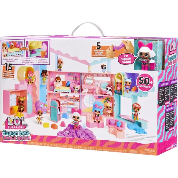 Voici la maison LOL Surprise Squish Sand Magic House avec une Tot ! Trouvez d’innombrables surprises cachées dans le Squish Sand spécial à mouler de LOL Surprise qui ne sèche pas ! Chaque pièce de la maison à la taille des tots contient des moules secrets en sable Squish Sand, où sont cachés des bijoux à découvrir ! Déballez plus de 50 surprises, dont la poupée LOL Diva préférée des fans, plus d’une demi-douzaine d’espaces de jeu, un ascenseur fonctionnel, 5 couleurs de sable Squish Sand et 15 moules avec des surprises à l’intérieur ! Mélangez les couleurs de Squish Sand pour obtenir une couleur différente, ou utilisez les meubles pour mouler votre sable en différentes formes, encore et encore ! Ferez-vous des gaufres violettes dans la cuisine, ou des gâteaux roses et bleus dans le réfrigérateur ? Chaque maison LOL Surprise Squish Sand House s’ouvre, fait 90 cm de large et comprend plus de 50 surprises : LOL tot- Diva, 5 couleurs de sable, 15 moules et plus d’une demi-douzaine d’espaces de jeu. Continuez à jouer avec LOL Surprise Squish Sand Magic Hair Tots pour encore plus de plaisir !Les poupées mannequin et de collection LOL Surprise, avec leurs beaux cheveux, leurs tenues amusantes et leurs nombreux accessoires détaillés, sont les jouets et les jeux préférés des enfants, y compris des filles et des garçons de 4 à 7 ans, pour des jeux de rôles imaginatifs ! Comme cadeau d’anniversaire ou pour toute occasion spéciale, les poupées offrent des heures de jeu entre frères, sœurs et amis ! Par MGA Entertainment, les créateurs des poupées mannequin et de collection LOL Surprise, des poupées mannequin Rainbow High, des poupées Na Na Na Surprise, des poupées Bratz, des poupées mannequin Dream Ella de MGA, des poupons Glitter Babyz de MGA, des poupées Lalaloopsy, Poopsie Surprise, des poupées de collection Baby Born Surprise, des jouets pour enfants Little Tikes et de nombreuses autres marques.