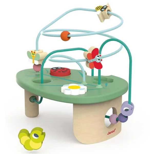 Looping au design très printanier en forme de feuille, équipé de 2 fils avec des perles en forme de papillons, chenille et abeille à faire coulisser et 3 pièces de puzzle à encastrer (fleur, chenille, coccinelle). Peinture standard. Impression par transfert à chaud.
