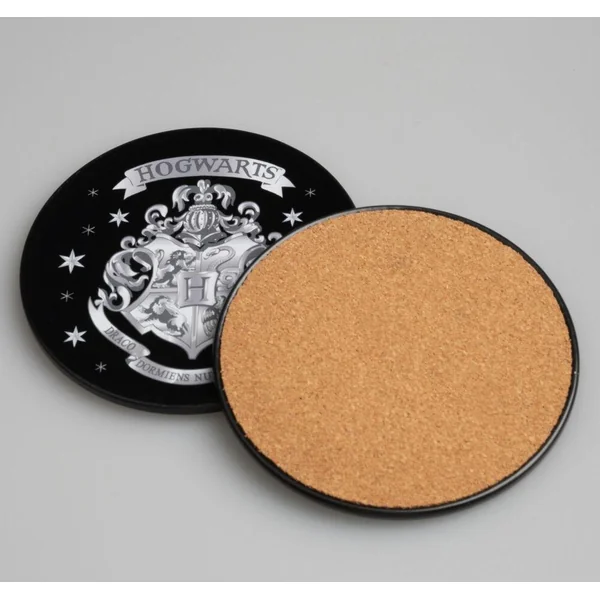 Lot de deux sous-verres avec base en liège et surface en étain avec motif imprimé. Dimensions : 9 x 9 cm.