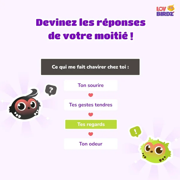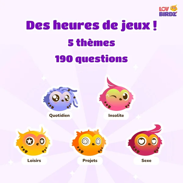 Besoin de redynamiser votre vie de couple ? LovBirdz, c’est le jeu de quiz idéal pour les couples qui veulent s’amuser à deux et renforcer leur complicité ! Cette application est la nouvelle alliée des couples qui veulent passer du temps de qualité à 2 et créer de nouveaux rituels. Que vous soyez en couple depuis quelques mois ou plusieurs années, que vous soyez en relation à distance ou que vous viviez ensemble, LovBirdz vient casser votre routine pour créer de vraies discussions à deux et ouvrir le débat en couple.