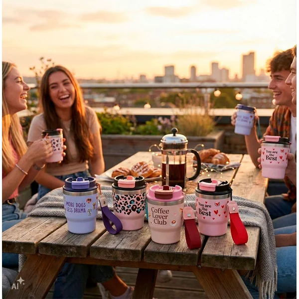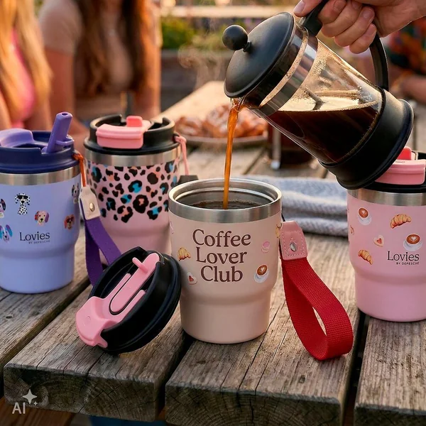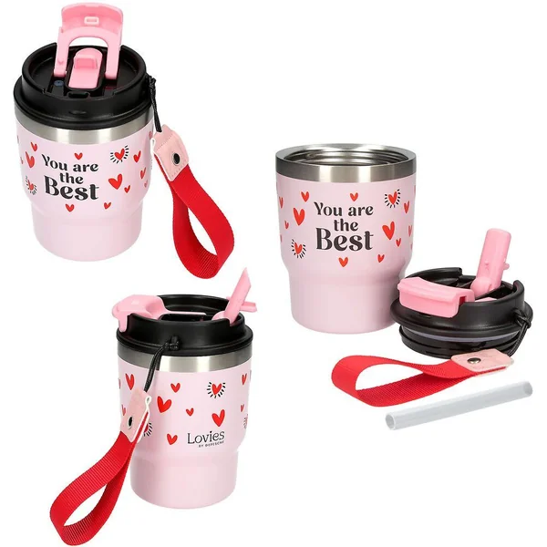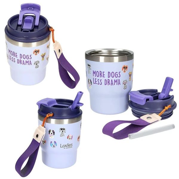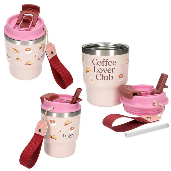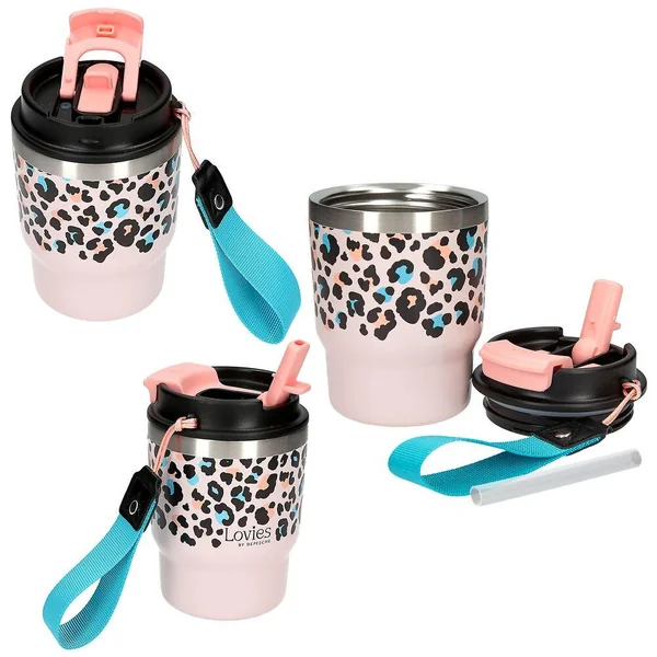 LOVIES Gobelet To-Go Élégant et pratique : ces gobelets à emporter de LOVIES avec une large dragonne pour la main te permettent de savourer ton boisson préférée tout en affirmant ton style. Le gobelet à double paroi a une contenance de 360 ml et garde les boissons chaudes pendant 6 heures et froides pendant 12 heures. Ce récipient peut être utilisé avec une paille ou avec l’ouverture pour boire. Quatre designs différents sont disponibles : imprimé léopard, chiens, cœurs ou pâtisseries et café. Matière : acier inoxydable, couvercle en plastique.