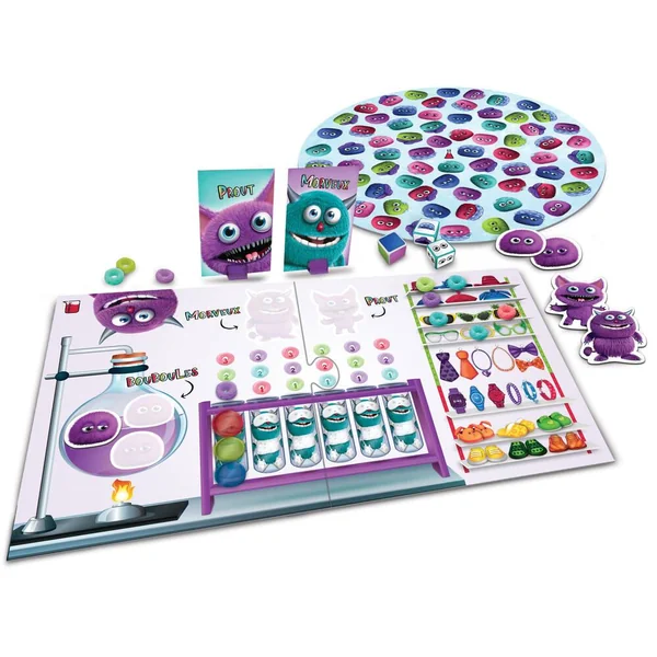 Le but est simple : rassembler votre troupe de monstres avant les autres. Ce jeu contient tout ce qu’il faut pour garantir des heures de divertissement : 4 planches représentant le fameux labo-dortoir, un lavoir des monstres, 20 monstres colorés, 60 cartes de jeu, et bien plus encore. Les enfants adoreront les 90 jetons colorés et les 3 dés plats qui ajoutent un élément d’imprévu à chaque partie.