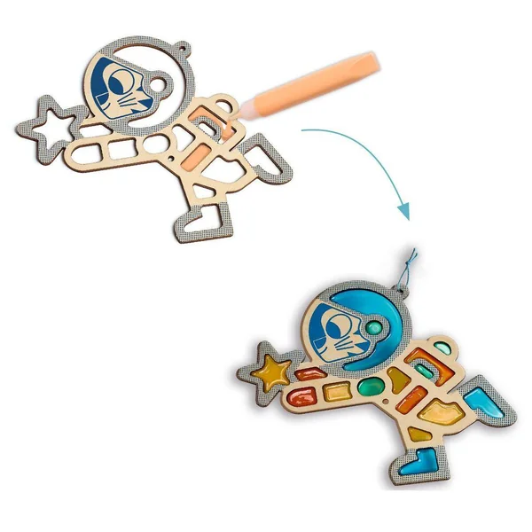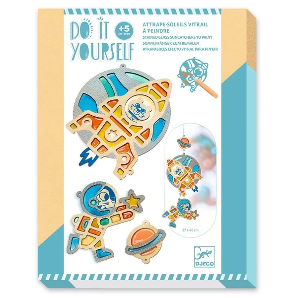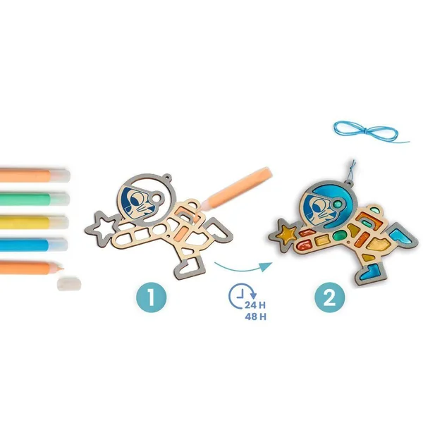 Un atelier créatif pour s’initier à la technique du vitrail et créer des attrape-soleils avec des couleurs vives laissant passer la lumière. L’enfant remplit de peinture vitrail les zones évidées dans les pièces en bois, couleur après couleur, en suivant les modèles fournis. Une fois la peinture séchée, il n’y a plus qu’à décoller les suatchers des supports de protection fournis et à ôter les films protégeant le bois d’éventuelles traces de peinture. Les attrape-soleils peuvent être supsendus individuellement ou assemblés en une pièce unique à placer à la fenêtre, pour laisser la lumière du soleil les traverser et révéler les nuaes de couleurs du vitrail créé.