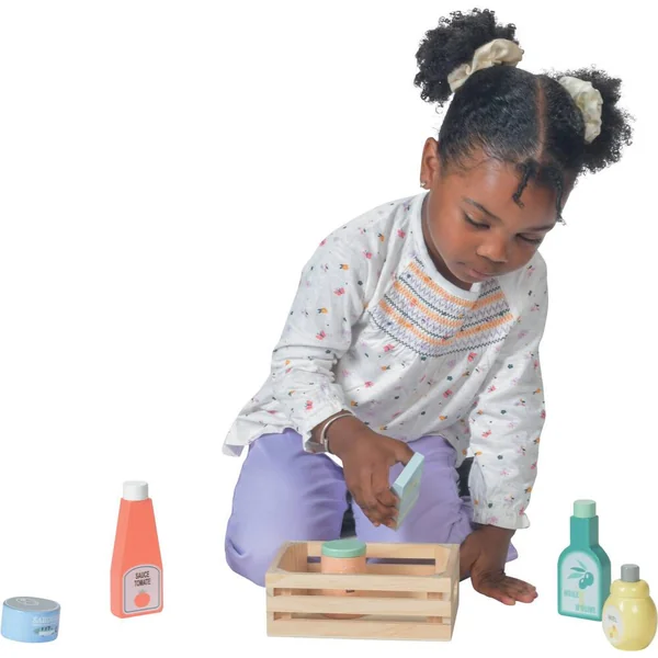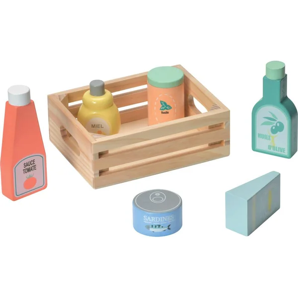 Cagette en bois contenant 6 accessoires pour le déjeuner dont : 1 bouteille de ketchup, 1 bouteille d’huile d’olive, 1 pot de miel et 1 boîte de sardine. En bois certifié. Avantages pour l’enfant : développement de l’imaginaire, apprentissage des objets, léger et facile à manipuler. Pratique tout se transporte dans la cagette, dimensions 15 x 11 x 6 cm.