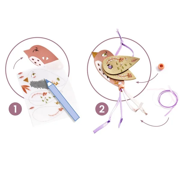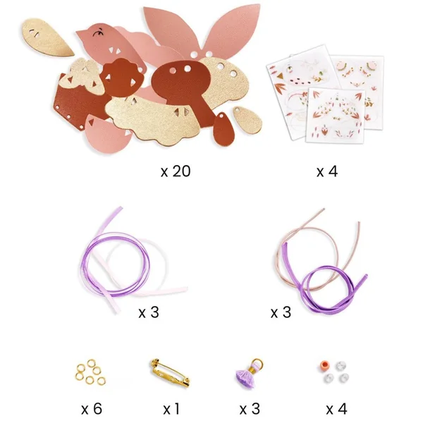 Un kit créatif pour réaliser une parure de bijoux raffinée en cuir synthétique, composée d’un collier, d’un bracelet, d’une broche et d’un bijou à cheveux. À l’aide d’un crayon, l’enfant frotte les décalcomanies pour les transférer sur les pièces en cuir en suivant les modèles proposés. Puis il assemble chaque bijou à l’aide des rubans, élastiques, fermoir, et les enrichit de pompons. Une délicate parure est ainsi réalisée, et n’a plus qu’à être portée. Lorsque la journée est terminée, le porte-bijoux permet de les accrocher en attendant le lendemain !