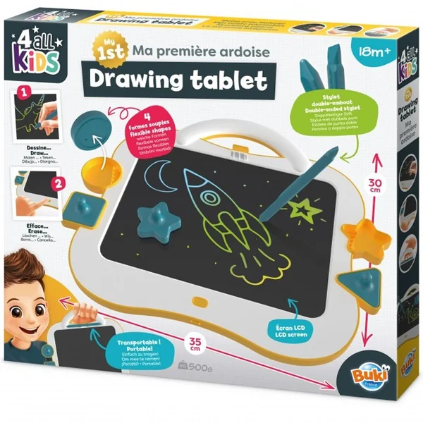 Une tablette LCD pour les tout-petits avec 4 formes tampons en silicone.