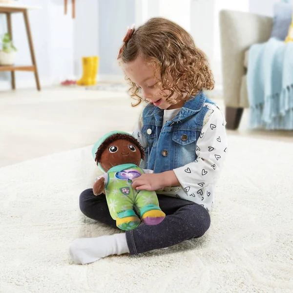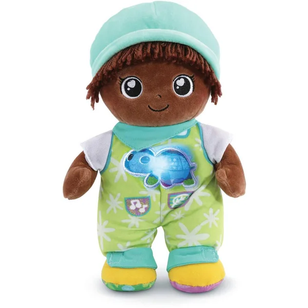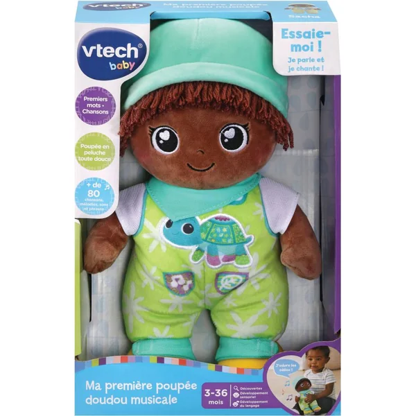 Ma première poupée doudou musicale Sacha. Différentes matières pour développer le sens du toucher : tissu, peluche, velcro. Deux modes de jeu : En mode Jour, le poupon joue des mélodies entraînantes et invite Bébé à explorer. En mode Nuit, il apaise Bébé en jouant de douces berceuses pour l’endormir. Deux boutons pour déclencher des mélodies et des phrases. Effet lumineux colorés sur le cœur du poupon. Plus de 80 chansons, mélodies, sons et phrases.