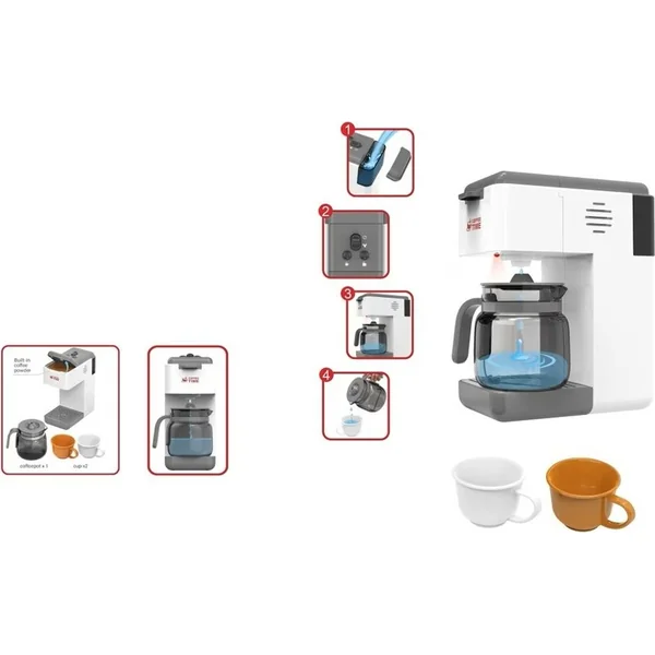 Machine à café avec effets lumineux et sonores pour chaque cuisine moderne. La machine à café comprend 2 tasses et une carafe à café. Après avoir rempli la machine à café d’eau, celle-ci libère de l’eau dans la carafe fournie. Le mode d’emploi illustré est sur l’emballage.