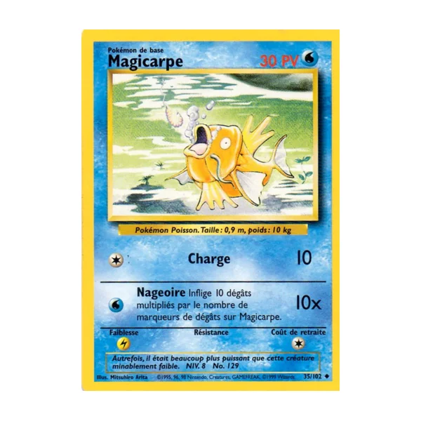 Découvrez Magicarpe (bs035), une carte Pokémon de l’extension Set de Base, provenant du bloc Wizards. Idéale pour compléter votre collection, cette carte Peu Commune plaira autant aux collectionneurs qu’aux joueurs.