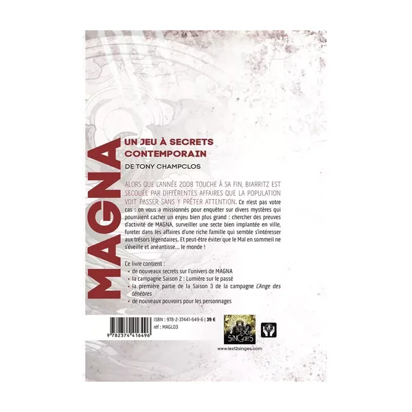 Ce n’est pas votre cas : on vous a missionnés pour enquêter sur divers mystères qui pourraient cacher un enjeu bien plus grand : chercher des preuves d’activité de MAGNA, surveiller une secte bien implantée en ville, fureter dans les affaires d’une riche famille qui semble s’intéresser aux trésors légendaires. Et peut-être éviter que le Mal en sommeil ne s’éveille et anéantisse… le monde !