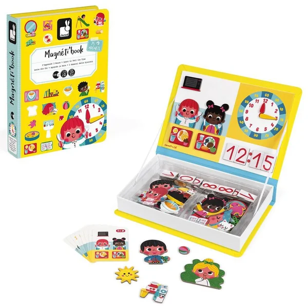 Jeu éducatif magnétique en carton sur le thème de l’apprentissage de l’heure. Composé de 75 magnets et de 8 cartes imprimées recto verso (= 16 scènes). Une fois le livre ouvert, le but du jeu est de recomposer la scène du quotidien indiquée sur la carte à l’aide des magnets. Le magnétibook est mixte –