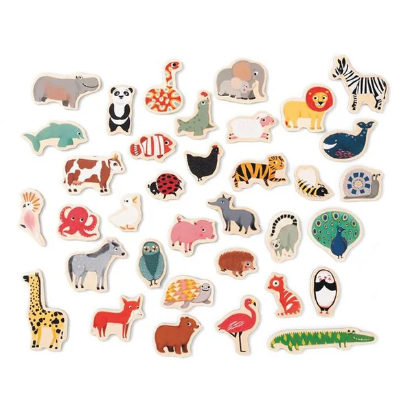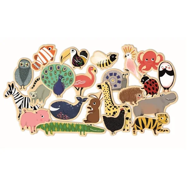 Magnimo est un jeu magnétique en bois représentant des animaux qui se collent sur un tableau ou sur un frigo.