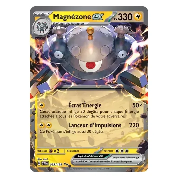 Découvrez Magnézone (svi065), une carte Pokémon de l’extension Écarlate et Violet, provenant du bloc Écarlate & Violet. Idéale pour compléter votre collection, cette carte Double Rare plaira autant aux collectionneurs qu’aux joueurs.