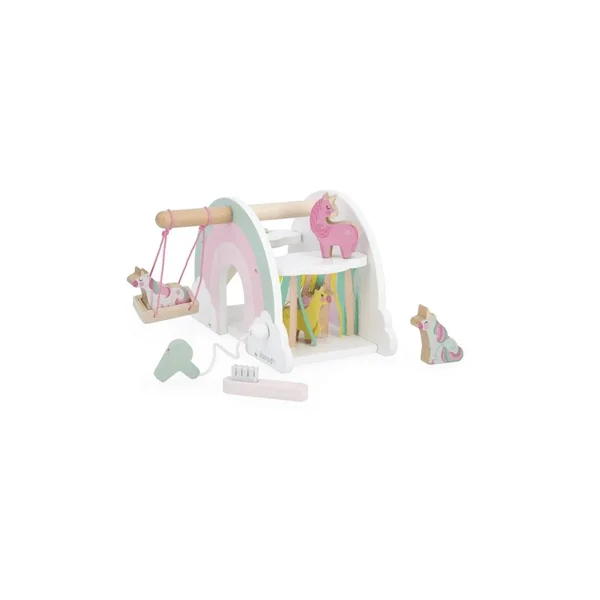 Livrée avec 4 figurines licornes et 2 accessoires en bois, cette maison magique favorise le développement de l’imagination des petits. Découvrez sans plus attendre toutes les surprises dont ils pourront profiter ! D’abord, les licornes peuvent s’en donner à cœur joie en glissant encore et encore sur un toboggan. Une jolie balançoire leur permet également de se balancer toujours plus haut dans les nuages ! Enfin, après une bonne journée passée à faire les folles et à partager leur magie, les licornes adorent être bichonnées ! Pour cela, on brosse leur crinière avec la brosse fournie et on passe au séchage express grâce au sèche-cheveux. Ce n’est pas tout ! Les licornes peuvent entrer dans la maison par deux portes latérales, et même passer sous une cascade de franges colorées. On vous fait une confidence : il y a même une porte miroir secrète … Quelque chose nous dit que les licornes, et les enfants, vont vivre de folles aventures dans cette fabuleuse maisonnette ! En manipulant les personnages en bois et les différentes ouvertures, les petits développent leur motricité en s’amusant.