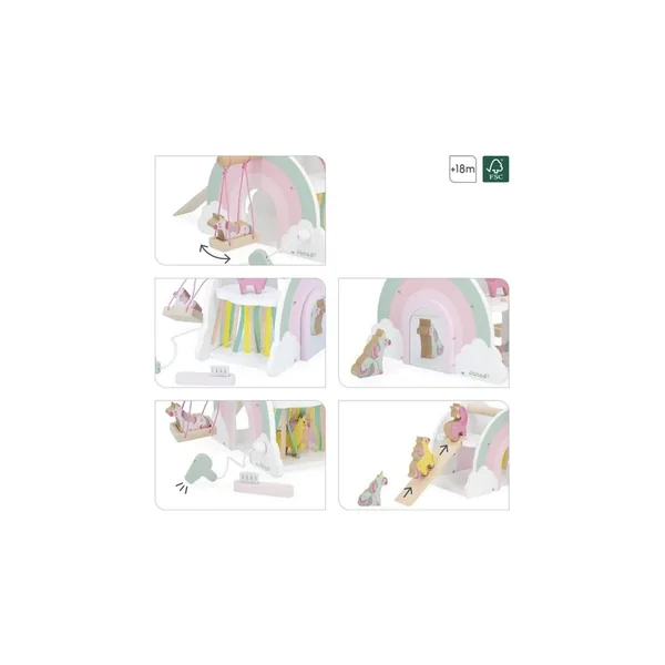 Dans son format 30 x 17 x 13 cm, cette maison en bois et ses personnages sont très originaux ! Le tout est composé de bois issu de forêts gérées durablement, certifié ***. Chez Janod, les licornes sont astucieuses et usent de magie pour garder leurs secrets. Impétueuses et iconiques, elles évoluent dans un univers poétique, aux couleurs intemporelles. Alors, laissez la magie opérer !