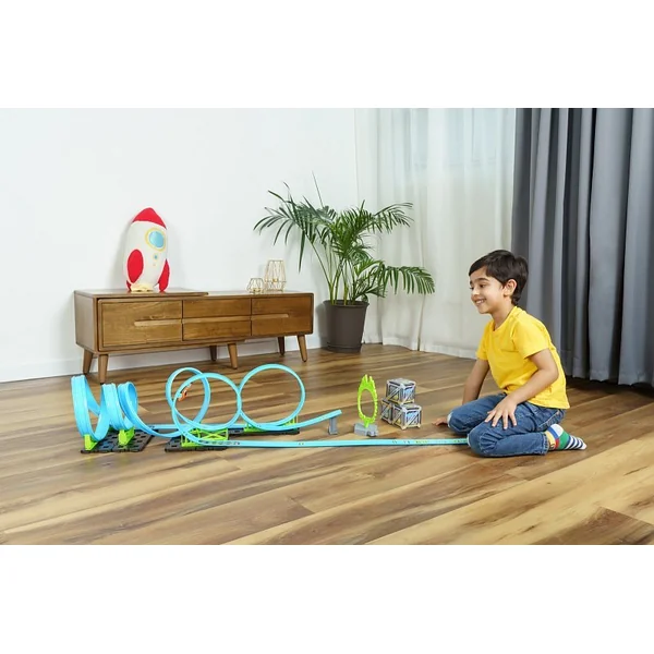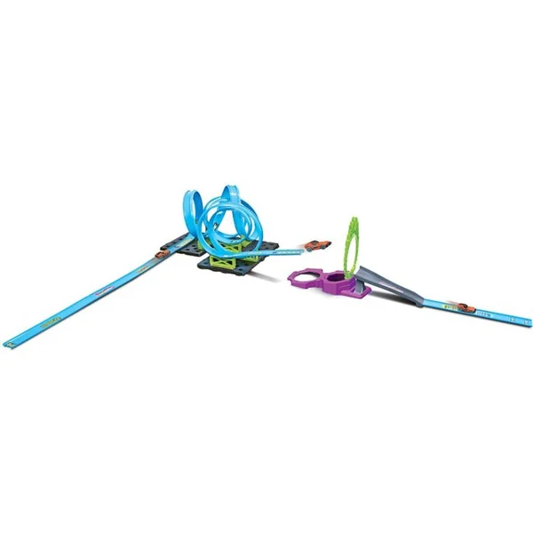 La piste de course colorée offre deux variantes de parcours pleines de boucles, de virages et d’obstacles. L’ensemble comprend deux voitures à remonter, un cerceau à traverser et des obstacles sur la ligne d’arrivée.