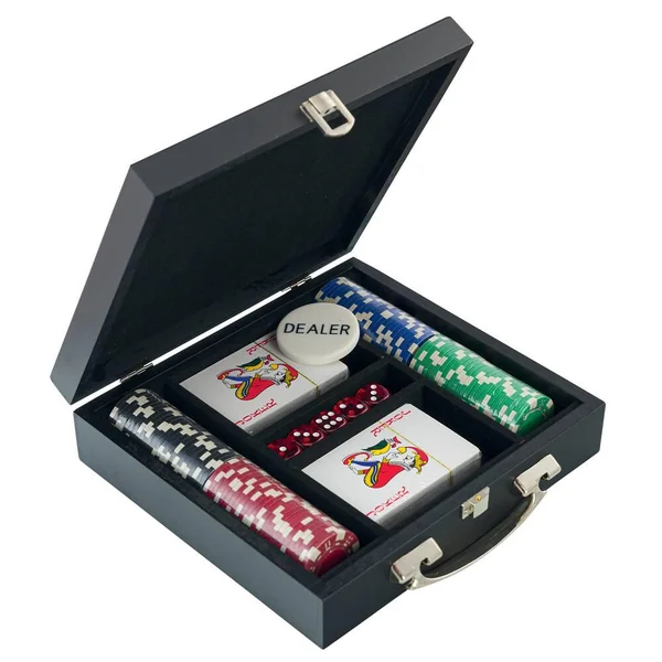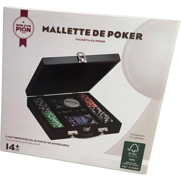 2 à 4 joueurs. Il faut remporter les jetons de tes adversaires ! Jeu de poker livré dans une mallette de transport. Contient : 100 jetons de 10.5 grammes, 1 bouton du donneur (jeton dealer), 2 paquets de cartes, 5 dés et les règles du jeu. Mallette en bois certifié. Dimensions de la mallette fermée : 22 x 22.5 x 6 cm.