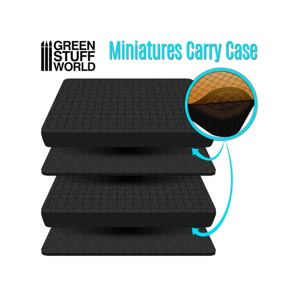 Composée de quatre mousses au total, de deux petits coussins de 8 mm d’épaisseur qui servent de base et de couvercle, et de deux plus grosses mousses de 25 mm d’épaisseur. Celles-ci peuvent être utilisées séparément pour avoir des figurines de 25 mm couchés, ou peuvent être collés ensemble à l’aide de l’adhésif inclus et faire une mousse de 50 mm d’épaisseur où vous pouvez placer vos miniatures debout entièrement protégées.