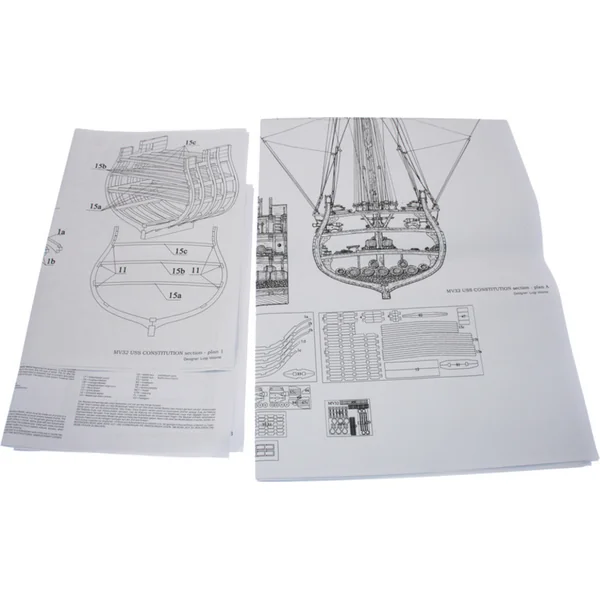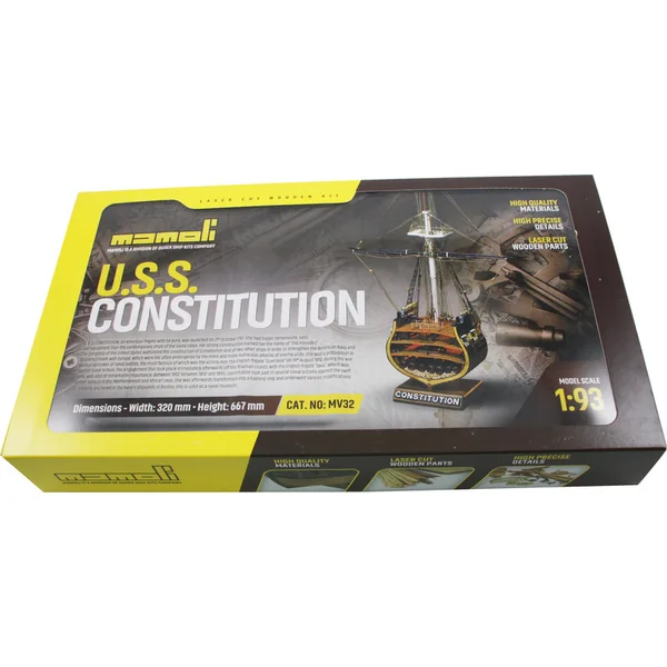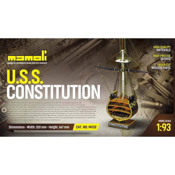 Kit de construction de la partie du modèle non flottant MAMOLI USS Constitution coupe transversale 1:93 avec des paramètres – largeur 320mm et hauteur 667mm. L’USS Constitution est une frégate en bois à trois mâts de la marine des États-Unis, qui est en service depuis 1797 jusqu’à aujourd’hui. L’emballage contient des pièces en bois, des baguettes et de nombreux accessoires, cordages, plans, etc.