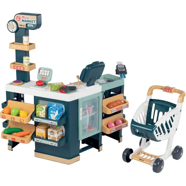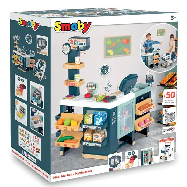 Grande marchande avec plusieurs espaces de jeu : passage en caisse, mini rayons dont 1 zone avec frigo, coin légumes/fruits, pesée (nouvelle balance avec action mécanique (le poids affiché s’ajuste en fonction des aliments pesés). L’enfant peut régler l’horloge et le panneau de l’enseigne (ouvert/fermé).