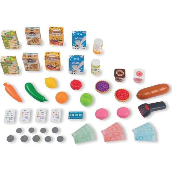 50 accessoires inclus : 8 boites factices (céréales, pâtes, cookies, lait), 2 canettes, 2 yaourts, 6 fruits et légumes, 2 macarons, 2 tartelettes, 1 pain, 1 lecteur de code-barres électronique avec son et lumière, 4 tickets de caisse, 1 carte de crédit, 9 pièces, et 12 billets.