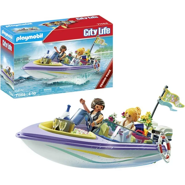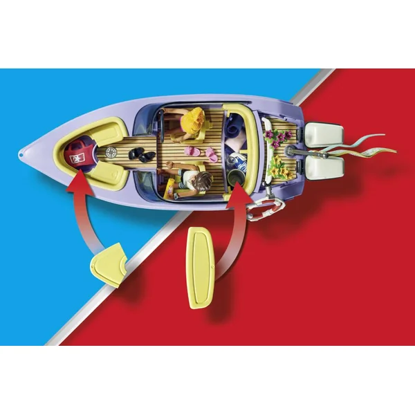 Regarde là-bas ! Des dauphins ! Après une grande cérémonie, les jeunes mariés s’offrent des vacances en amoureux sur un bateau. Nager, bronzer au soleil, observer les animaux marins… On peut faire tellement de choses avec un bateau ! Avec le coffre caché sous la banquette, on peut ranger beaucoup d’accessoires. Comprend deux personnages, un bateau et de nombreux accessoires. Le bateau est compatible avec la réf 7350, qui permet de le piloter à distance.