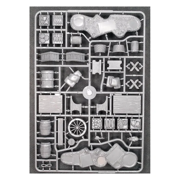 Cet ensemble en plastique comprend deux grappes uniques qui peuvent être assemblés pour créer 8 barricades OU les mêmes composants (à l’exception des bases des barricades) peuvent être utilisés pour construire un marché complet comprenant des étals couverts, des tables à tréteaux, des chaises, des coffres, des seaux, des paniers, des tonneaux, des sacs, des pots, des caisses et une variété de denrées alimentaires !