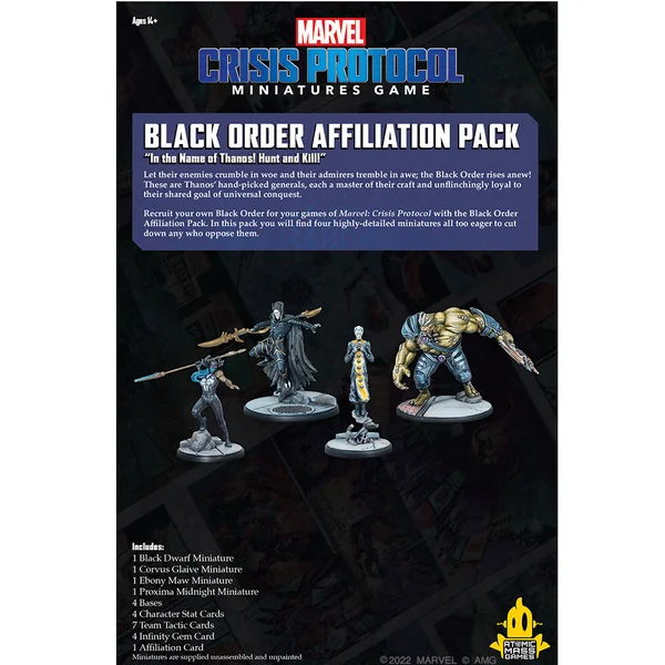 Réunissant les personnages initialement présents dans Corvus Glaive & Proxima Midnight et Black Dwarf & Ebony Maw, ce pack est l’endroit idéal pour que vos joueurs commencent à construire leur propre Ordre noir. En plus des figurines de chacun de ces personnages, ce pack comprend également des cartes de statistiques avec un design graphique actualisé pour les quatre personnages, ainsi que toutes les cartes de tactique d’équipe présentes dans les packs originaux. Enfin, les joueurs trouveront également des copies des Gemmes d’Infinité Espace, Temps, Esprit et Réalité qui les aideront à débloquer tout le potentiel de leurs personnages de l’Ordre Noir.