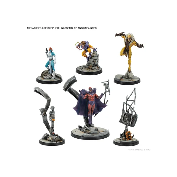 Ce kit de démarrage contient toutes les figurines, les cartes de statistiques des personnages et les cartes de tactiques d’équipe pour les personnages suivants : Cyclope, Wolverine, Tornade, Beast, Rogue, Gambit, Magneto, Toad, Mystique et Sabretooth.