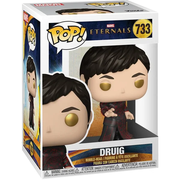 Série Pop! Marvel : Eternals (en français Marvel : Les Eternels). Figurine en vinyle avec tête dodelinante (oscillante). La tête montée sur ressort bouge d’un côté à l’autre. Il s’agit du personnage de Druig dans le film Les Eternels.