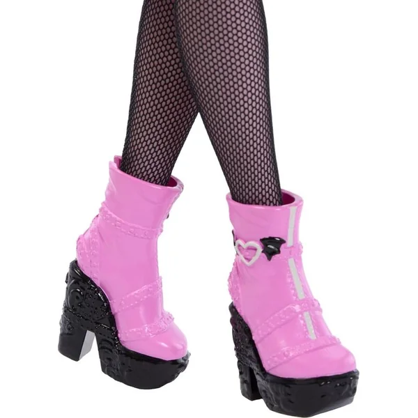 Pour compléter son outfit, Draculaura porte un chapeau noir à large bord orné de motifs complexes. Elle porte un choker ailé et des boucles d’oreilles en forme de cercueil, une noire et une rose. Son look est complété par des bas noirs et des escarpins roses avec des talons noirs sur plateforme.