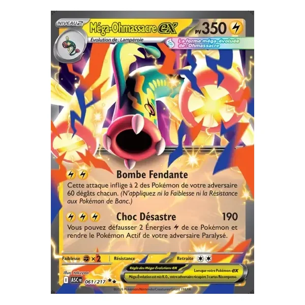 Découvrez Mega Ohmassacre (asc061), une carte Pokémon de l’extension Héros Transcendants, provenant du bloc Méga-Évolution. Idéale pour compléter votre collection, cette carte Double Rare plaira autant aux collectionneurs qu’aux joueurs.