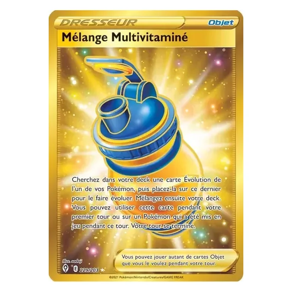 Découvrez Mélange Multivitaminé (evs229), une carte Pokémon de l’extension Évolution Céleste, provenant du bloc Épée & Bouclier. Idéale pour compléter votre collection, cette carte Secret Rare plaira autant aux collectionneurs qu’aux joueurs.