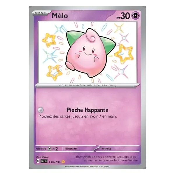Découvrez Mélo (paf150), une carte Pokémon de l’extension Destinées de Paldea, provenant du bloc Écarlate & Violet. Idéale pour compléter votre collection, cette carte Shiny Rare plaira autant aux collectionneurs qu’aux joueurs.