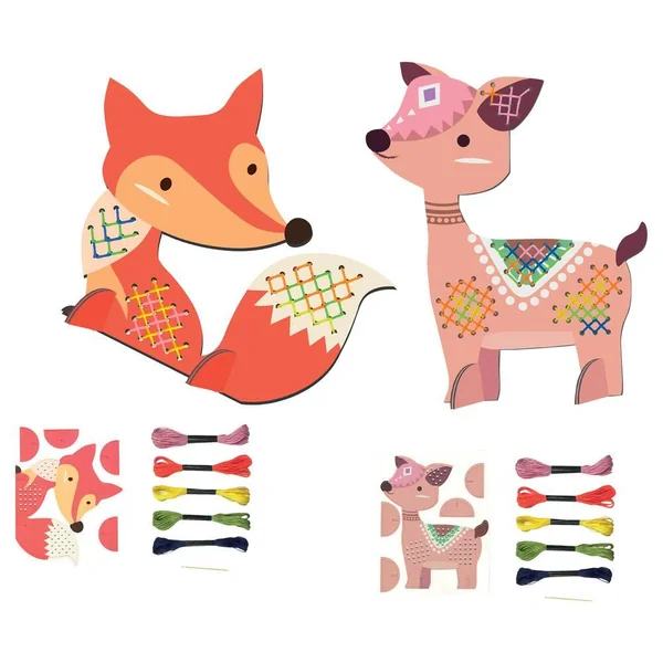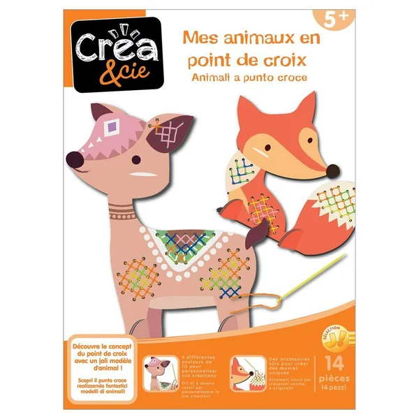 Découvre le concept du point de croix avec un joli modèle animal. 2 animaux à réaliser : un renard et une biche. Des accessoires sûrs pour créer des œuvres uniques et 5 différentes couleurs de fils pour personnaliser tes créations. Contient : 2 différents modèle de support en carton (renard et biche), 2 aiguilles en plastique, 10 fils dont 5 couleurs différents. Instructions incluses. Dimensions du renard : 19,5 x 5 x 17 cm, de la biche : 17,5 x 5 x 27 cm.