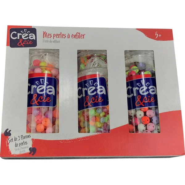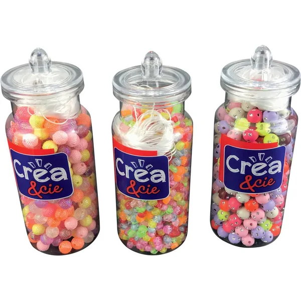 Pack contenant 3 bouteilles de perles différentes : perles brillantes aux couleurs chaudes, perles plates de couleur avec des lettres, et perles avec strass aux couleurs chaudes. Fil inclus. Chaque bouteille en plastique contient 10 mètres de fil en spandex et des perles en acrylique.