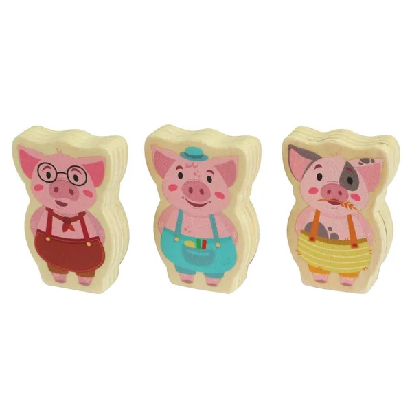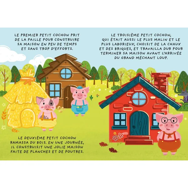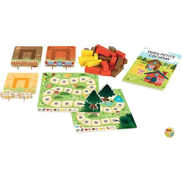 Les 3 petits cochons sont occupés à construire leurs 3 maisons, mais ils doivent rester vigilants : le loup n’est pas loin, et il peut arriver à tout moment ! Les trois frères parviendront-ils à terminer le travail avant l’arrivée du loup ? L’histoire des 3 petits cochons en version jeu de société, avec un plateau illustré pour 2 versions de jeu, 4 pions en bois avec les personnages, tous les matériaux pour construire les 3 maisons et un grand dé pratique. Adapté à partir de 3 ans, pour passer de bons moments en famille !