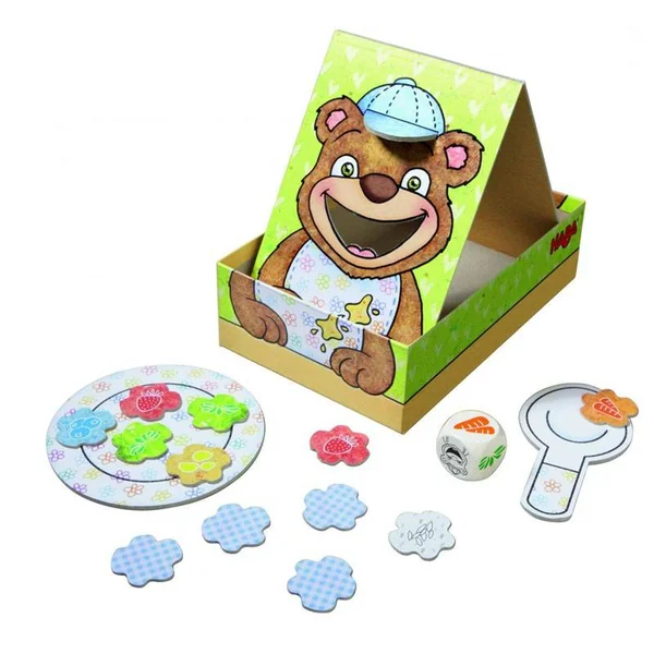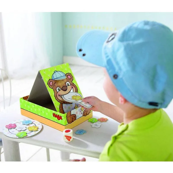 Lancez le dé et posez la tuile de l’aliment sur la cuillère puis glissez-la dans la bouche de l’ourson. À la fin de la partie, la pile des aliments qui ont bien été mangés doit être plus grande que celle des aliments tombés de la cuillère. Un jeu d’adresse coopératif.