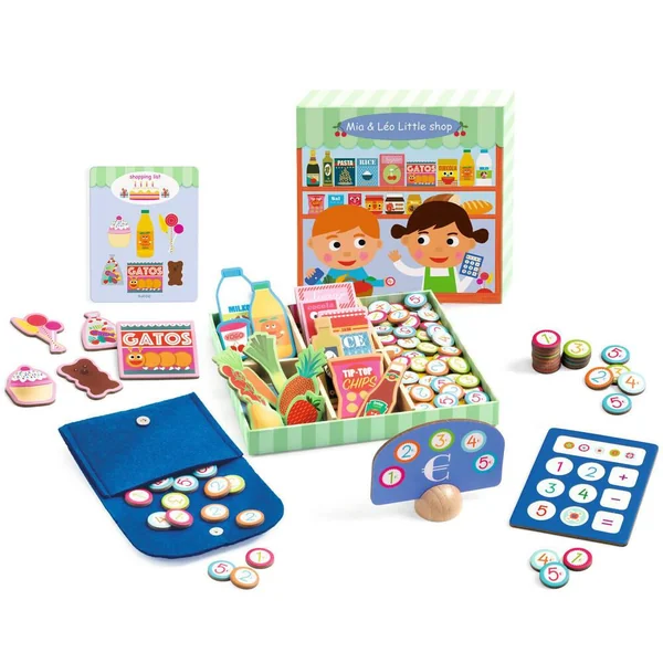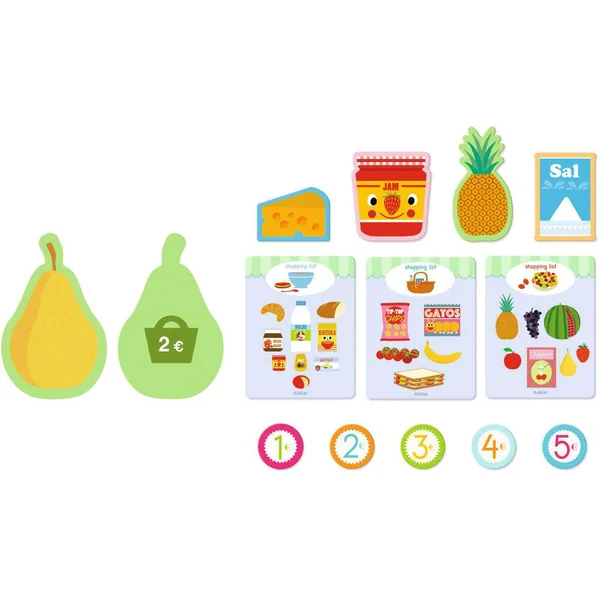 Un coffret complet contenant 45 accessoires pour jouer au marchand ou à la marchande. Chacun son rôle ! Le vendeur dispose correctement les aliments dans son stand, il tient la caisse et calcule le montant des courses. Le client fait ses courses comme il le souhaite ou en suivant les listes de courses thématiques, puis passe à la caisse grâce à son porte-monnaie.