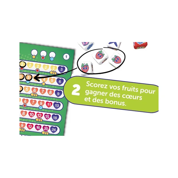 Le but : avoir coché 50 cœurs avant vos adversaires et marquer le maximum de points ! Chaque lancer vous offre des choix : quelles brochettes de fruits avez-vous le plus de chance de générer ? Quels dés relancer ? Faut-il utiliser le dé rouge bonus ? A chaque tour, vous pourrez aussi acheter des cartes Miams aux effets variés pour booster votre stratégie : effets permanents, bonus immédiats ou fin de tour… Pimpez votre jeu des bons effets pour enchaîner les combos !