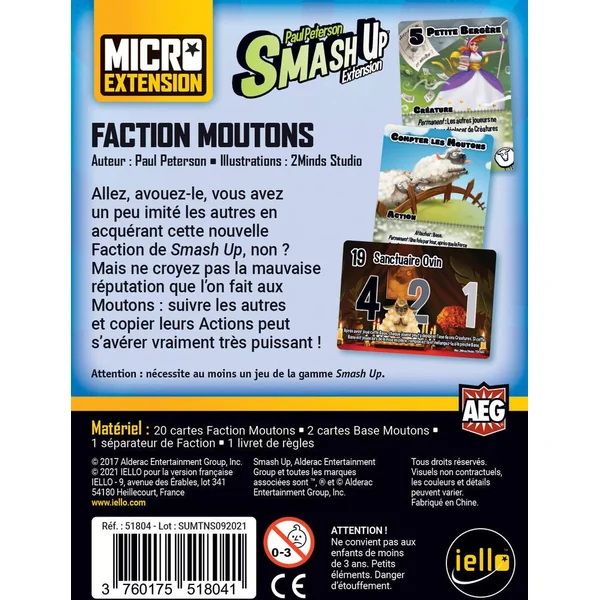 Cette extension apporte à Smash Up une toute nouvelle Faction à inclure à vos parties ! Mais ne croyez pas la mauvaise réputation que l’on fait aux Moutons : Suivre les autres et copier leurs Actions peut s’avérer vraiment très puissant !