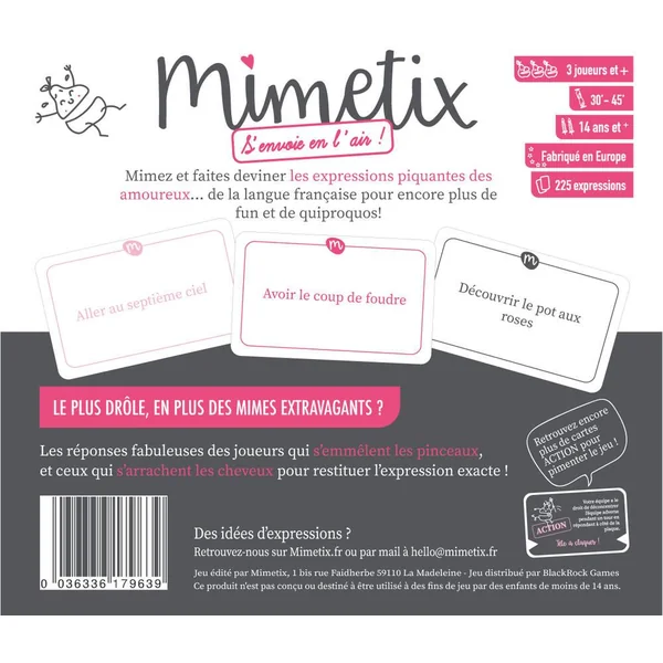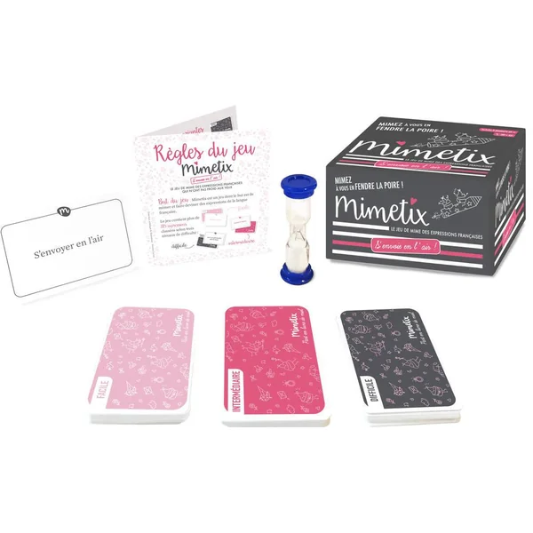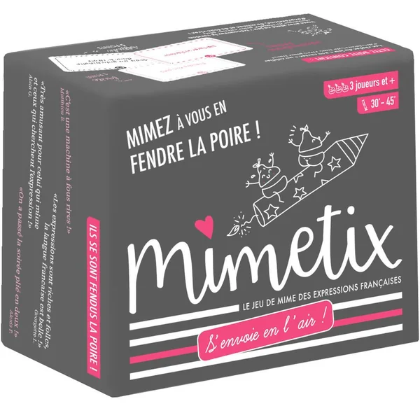 Vous allez devoir mimer et faire deviner le plus d’expressions possibles à votre équipe dans un temps imparti. Un jeu de mimes des expressions françaises, qui vous fera pleurer de rire entre copains, en famille, ou avec les collègues. Mimetix « S’envoie en l’air » est la nouvelle version du jeu Mimetix, un jeu extrêmement drôle pour des heures et fous rires en perspective. On s’amuse à mimer en moins d’une minute, les expressions « olé olé » des amoureux… de la langue française! Préparez-vous à «monter en température» et «prendre votre pied», sans forcément «passer à la casserole»!