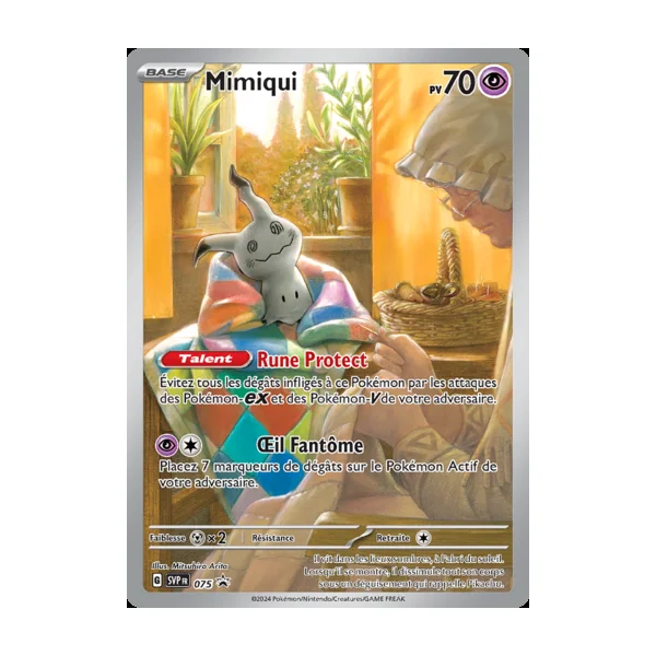 Découvrez Mimiqui (svp075), une carte Pokémon de l’extension Promos Écarlate a Violet, provenant du bloc Écarlate & Violet. Idéale pour compléter votre collection, cette carte Promo plaira autant aux collectionneurs qu’aux joueurs.