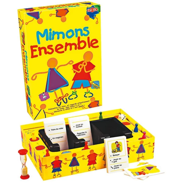 Un jeu de mimes et de parcours pour les enfants alliant compréhension et action. Les plus jeunes participeront de façon autonome à partir des cartes illustrées; les plus âgés qui savent lire mimeront les différents sujets selon plusieurs niveaux de difficultés. Contenu du jeu : 150 cartes dont 50 imagées, 1 plateau de jeu intégré à la boîte, 6 pions de jeu, 1 sablier, 1 dé.