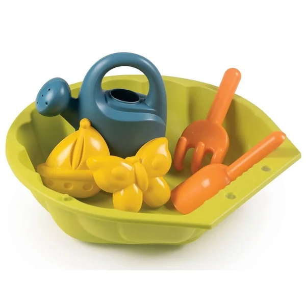 Mini bac à sable en forme de coquillage garni d’une doublette (pelle + râteau), de 2 moules à sable et d’un arrosoir. Deux usages possibles : un jeu de plage à transporter ou un mini bac à sable pour les petits espaces. Compact (35x35cm). Fabrication française.